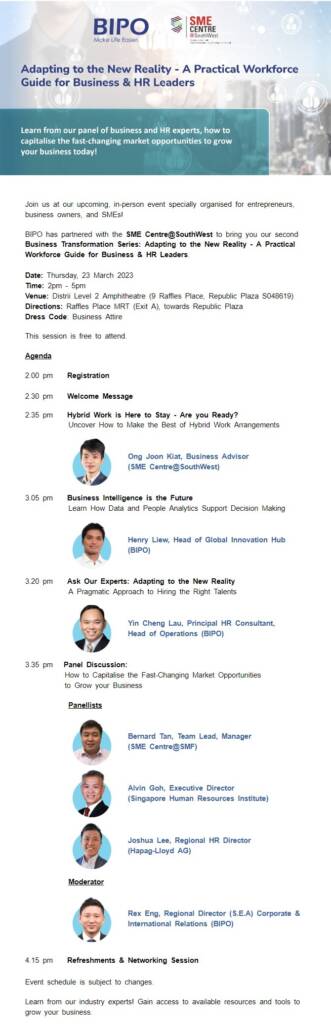 SME Centre@SouthWest has partnered with BIPO to bring you this capability workshop: Adapting to the New Reality – A Practical Workforce Guide for Business & HR Leaders.Learn from industry experts and gain accessible resources and tools to grow your business!Date: Thursday, 23 March 2023